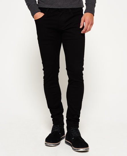 Miesten Superdry-pillifarkut. Piukat farkut, joissa on perinteiseen tapaan viisi taskua ja vetoketjusepalus. Merkki vyötärönauhassa ja kirjailtu logo kolikkotaskussa. Farkuissa on myös Superdry-merkkikuvioidut napit ja niitit.