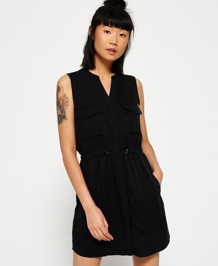 Naisten Superdry Utility -paitamekko. Hihaton napitettava paitamekko kevyestä, kauniisti laskostuvasta materiaalista. Paitamekossa on neljä etutaskua, kiristysnyöri vyötäröllä ja painonapit edessä. Utility-paitamekon vasemmassa taskuläpässä on metallinen Superdry-logomerkki.Mallin päällä oleva koko: Small Mallin pituus: 175 cm Mallin rinnanympärys: 81 cm