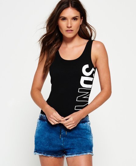 Naisten Superdry West Side -body. Erinomaisesti kerrospukeutumiseen soveltuva hihaton body, jossa on syvään uurrettu kaula-aukko ja painonappikiinnitys. West Side -bodyn toisessa sivussa on iso Superdry-akryylilogo ja helmassa Superdry-logolappu.
