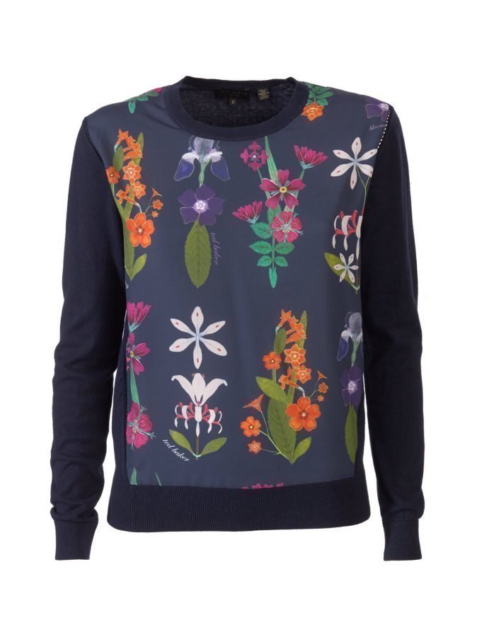 Nantise-neuleen sileässä ja laskeutuvassa etuosassa on kuvattu kukkaloistoa. Hihat ja takakappale ovat pehmeää puuvillaneulosta, olilla on reikäneulosta.