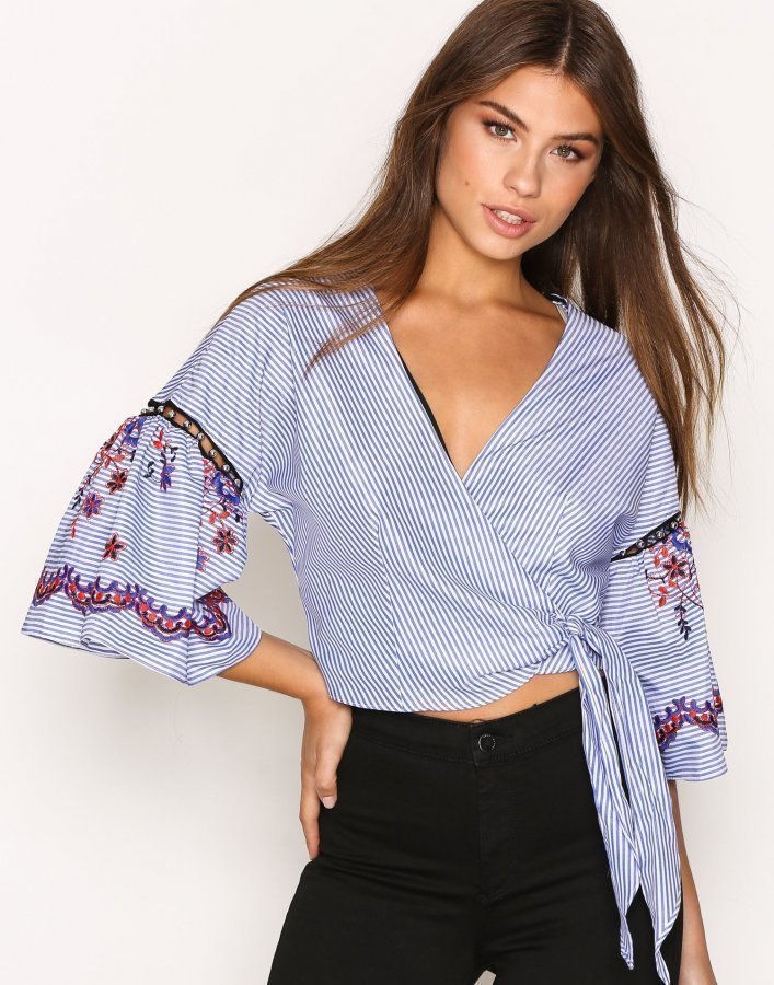 Topshop pusero. Lyhyt malli kietaisulla ja solmittavalla osuudella edessä. Väljät hihat brodeerauksella. Valmistettu 100 % Puuvillasta. Malli: Malli on 175 cm pitkä ja käyttää kokoa EU 36. Tuotenumero: 353836-0989. Väri: Blue. Kategoriaryhmä: Vaatteet / Paidat & Topit / Oversized. Koot: EU 34, EU 36, EU 38, EU 40, EU 44, EU 42. Kohderyhmä: Naiset.