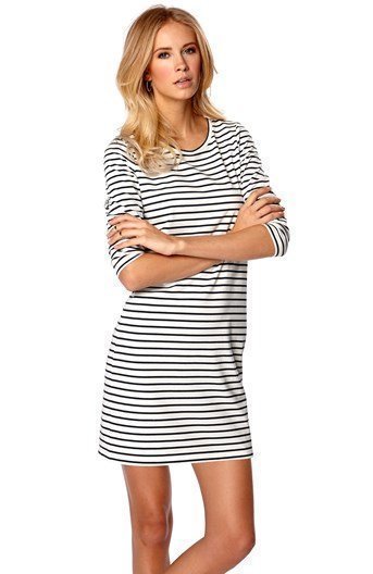 Lyhyt klassinen mekko jossa trendikkäitä raitoja. Pyöreä pääntie, 3/4-hihat ja takana näkyvä vetoketju…. Lue lisää »