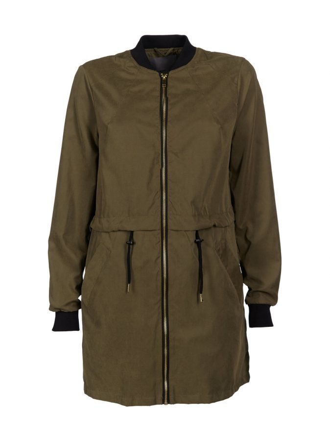 Vero Modan bombertyylisessä välikausitakissa on ihanan pehmeä pinta, avoimet etutaskut ja vyötäröllä säätönyöri. Pääntiellä ja hihansuissa on resorit.