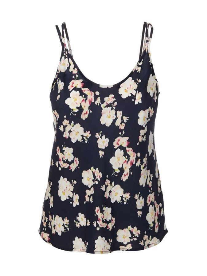 Väljänmallisessa topissa on kaunis kukkakuviointi ja kapeat olkaimet. Materiaali on 100 % viskoosia. Konepesu.