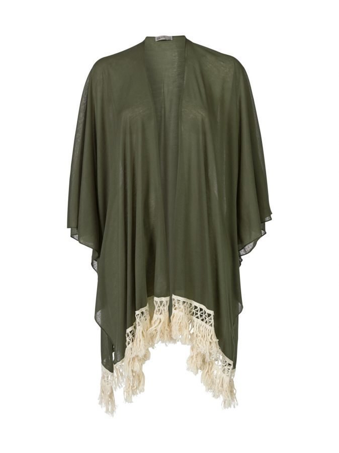 Väljänmallinen poncho on ohutta kangasta. Helmassa on trendikkäät hapsut. Sivuilla on pitkät halkiot.