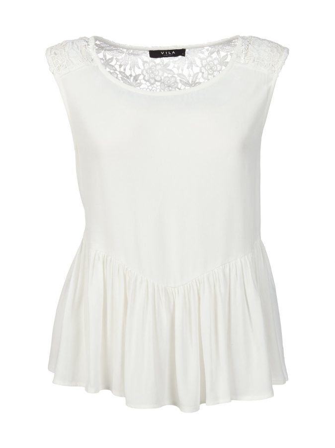 Sievässä topissa on pitsisomisteinen takakappaleen yläosa ja rypytetty helma. Materiaali on viskoosia ja polyesteriä. Konepesu.