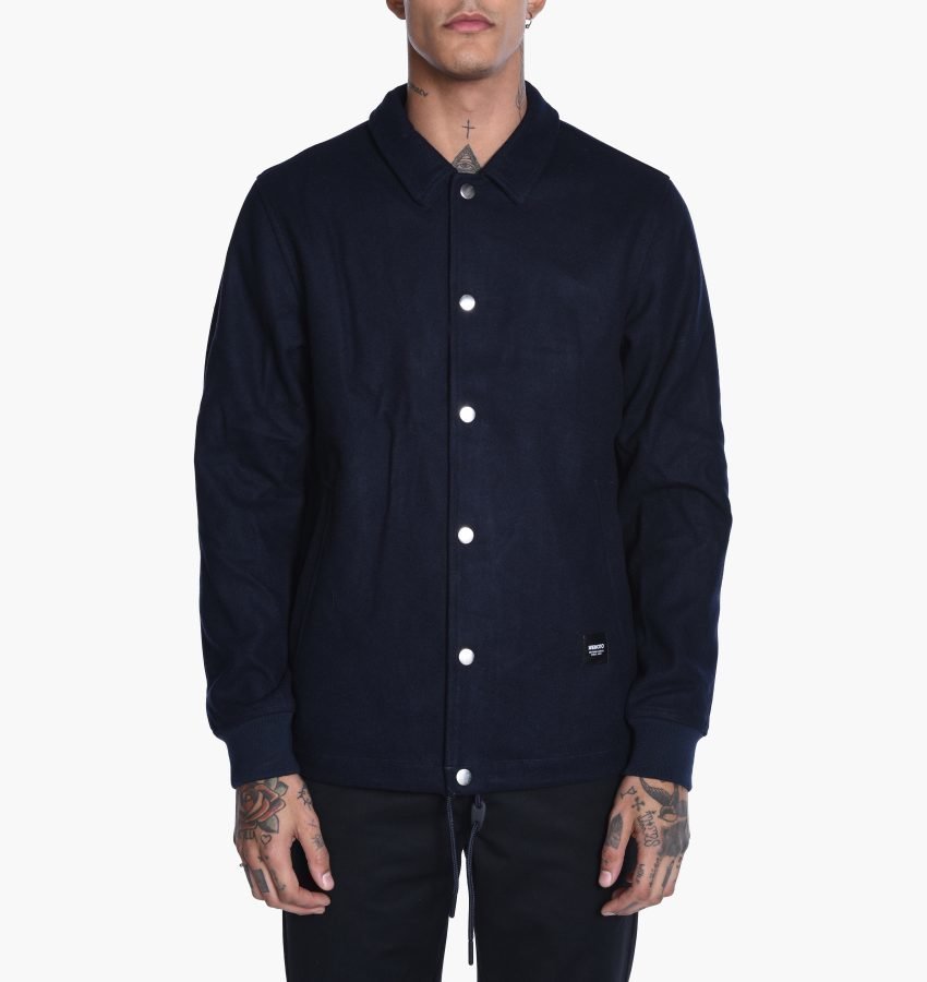 Wool coach jacket from Wemoto with metal snap buttons, ribbed collar and cuffs