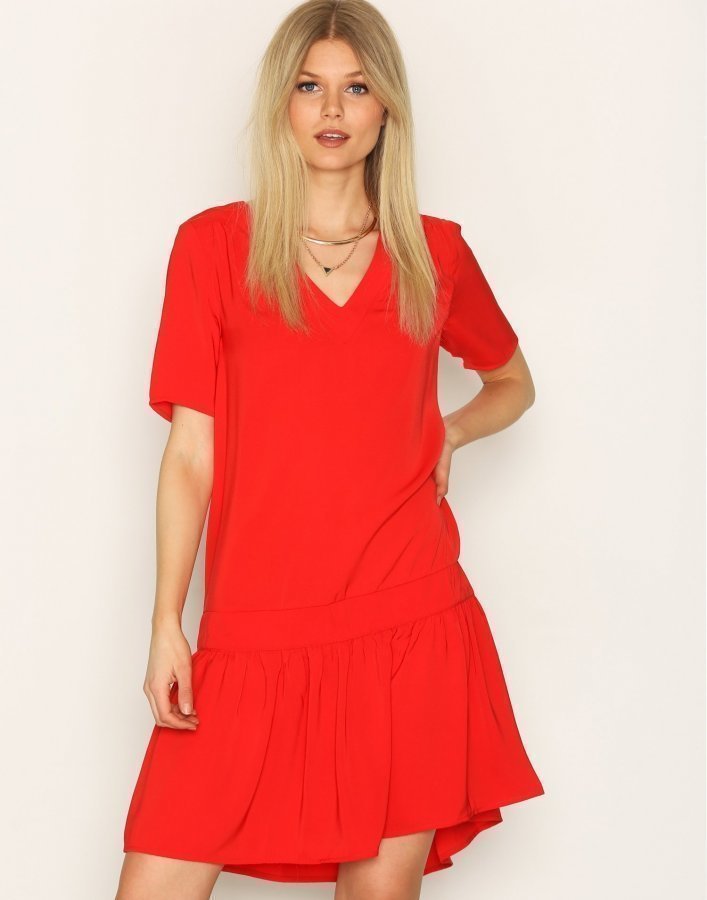 Y. A. S. mekko. Lyhythihainen malli v-aukolla. Röyhelö helmassa ja hieman levenevä hameosa. Valmistettu 100 % polyesterista. Tuotenumero: 48894-0259. Väri: Tummanpunainen. Kategoriaryhmä: Vaatteet / Mekot / Loose fit dresses. Koot: X-Small, Small, Medium, Large. Kohderyhmä: Naiset.